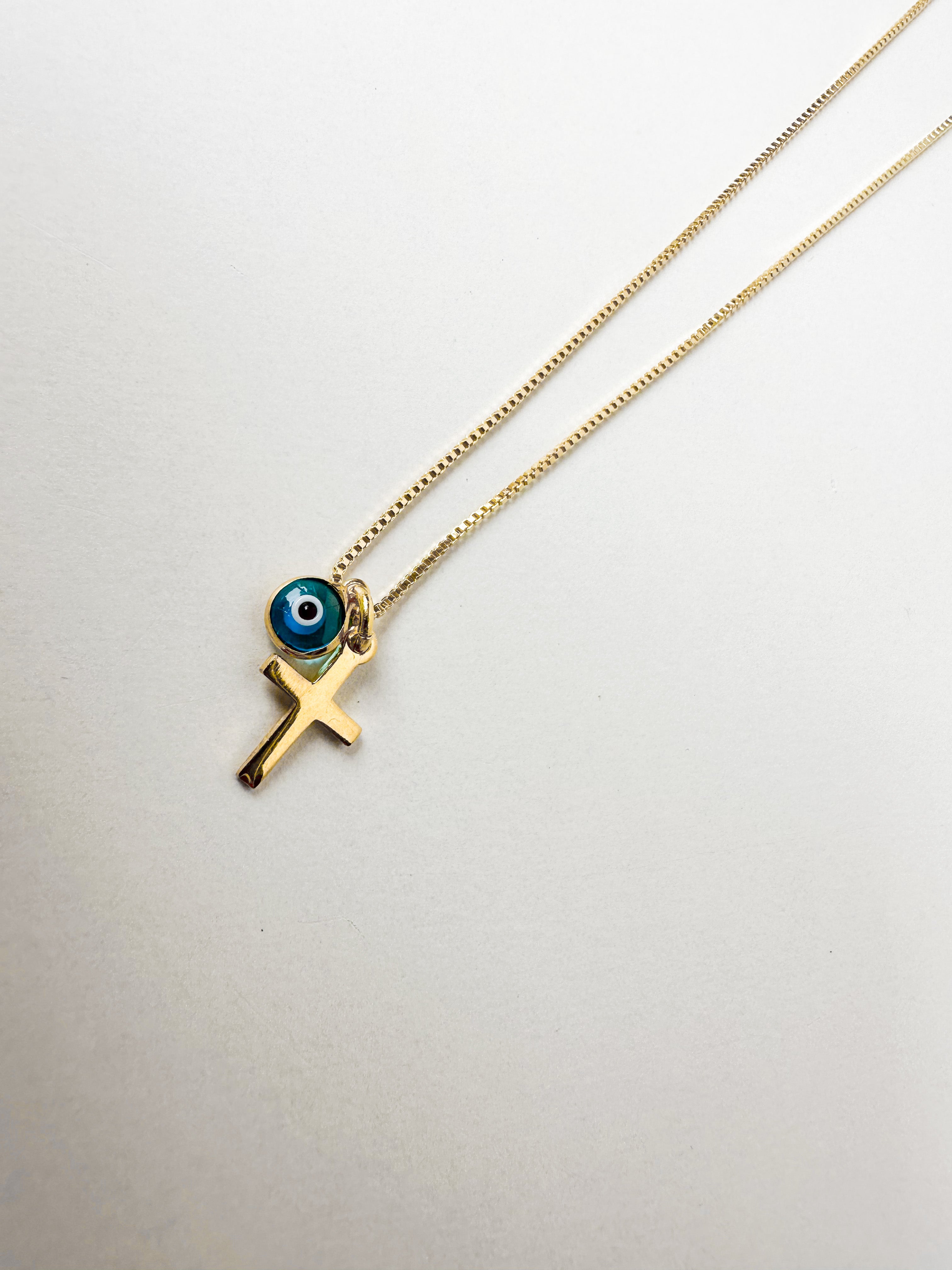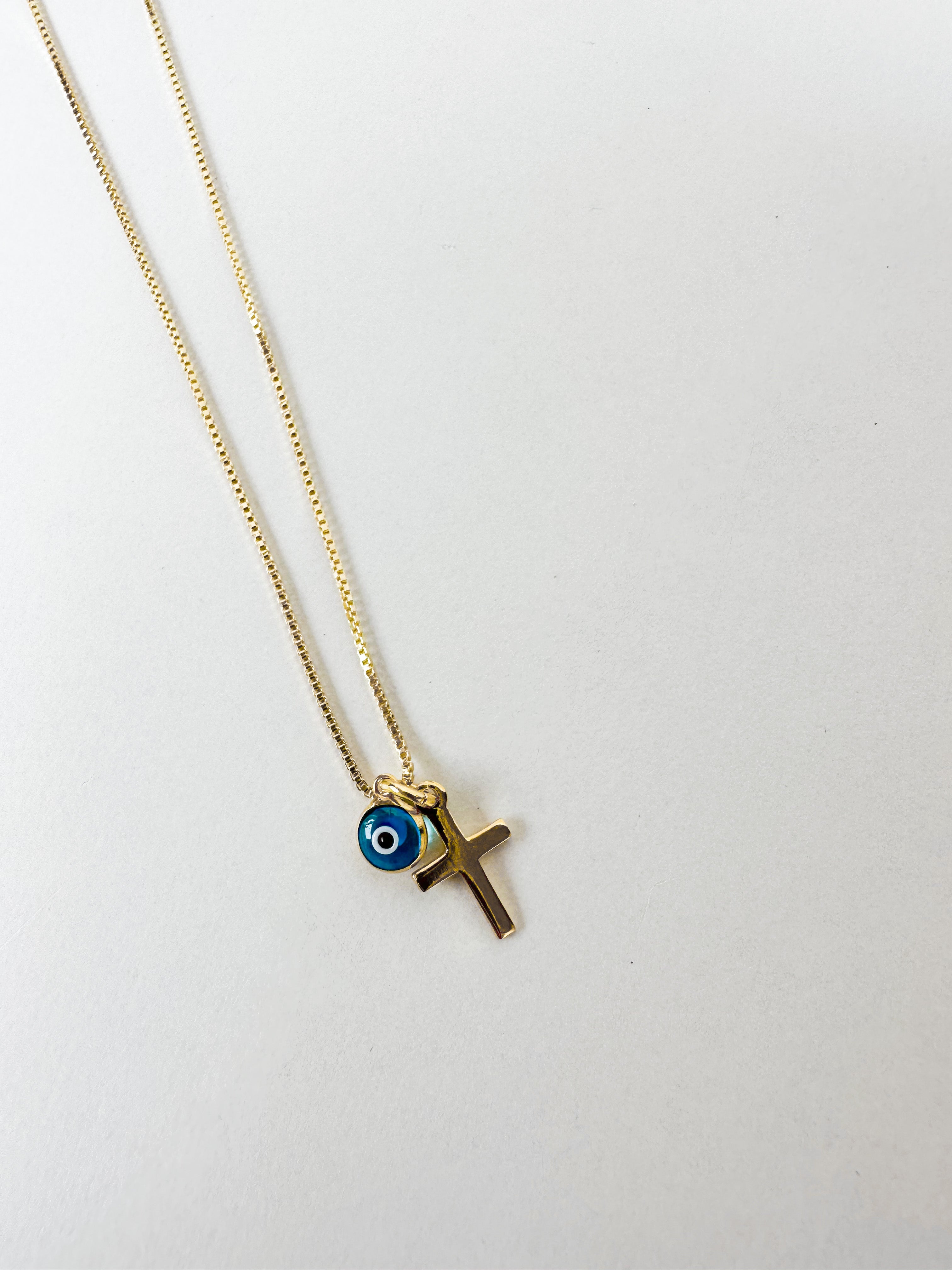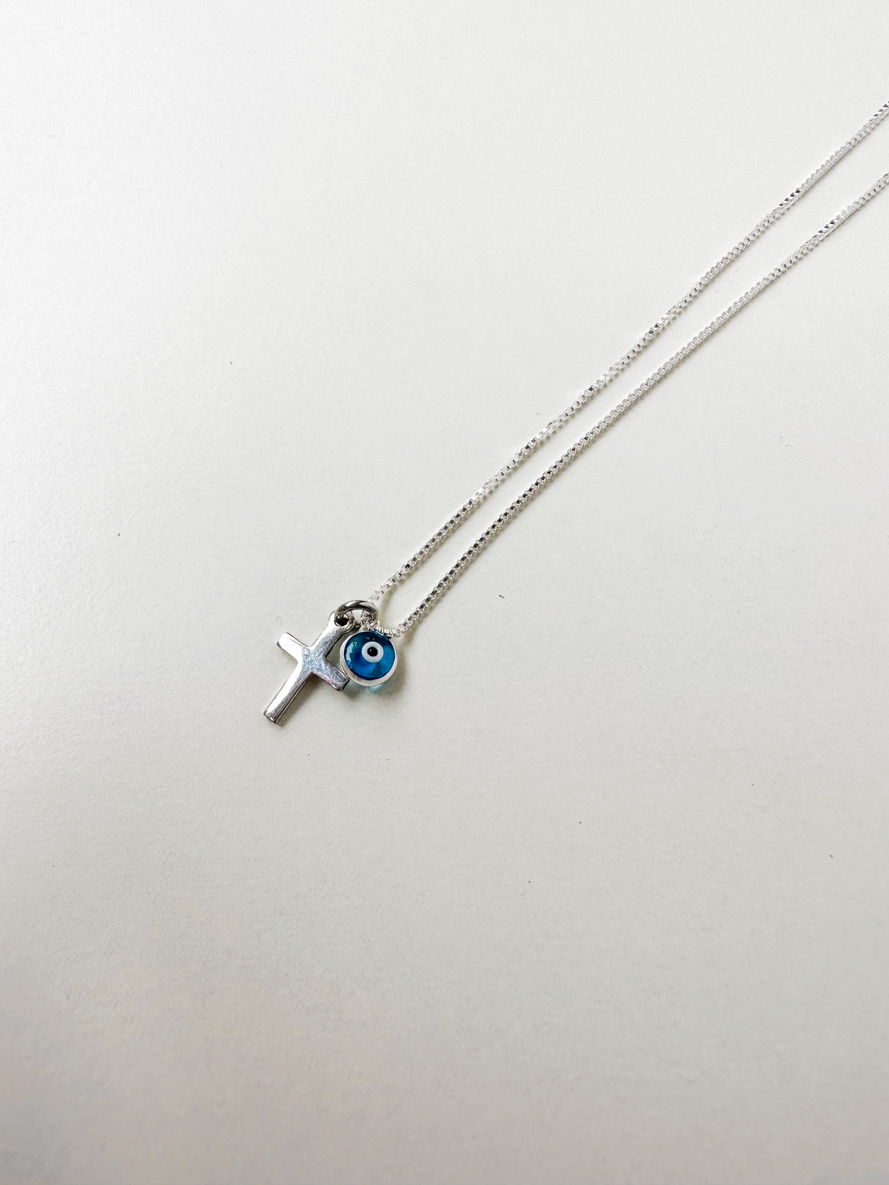 Introducing the Spirit Necklace - a stunning piece of jewellery that combines two powerful symbols of protection and spirituality. The necklace features both an evil eye charm and a cross charm, making it a unique and meaningful addition to any jewellery collection.